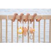 Díky třem hravým prvkům vytvoří tato spirála usměv na každé malé tváři! Spirála se dá pěkně zatočit kolem jakéhokoli nosítka nebo ohrádky. Tři různé hračky, dřevěný kroužek, šustivý papír a zrcátko jsou připevněny pomocí praktických kroužků, lze je tedy snadno vyjmout a pokračovat v zábavě mimo dětskou postýlku nebo ohrádku.
