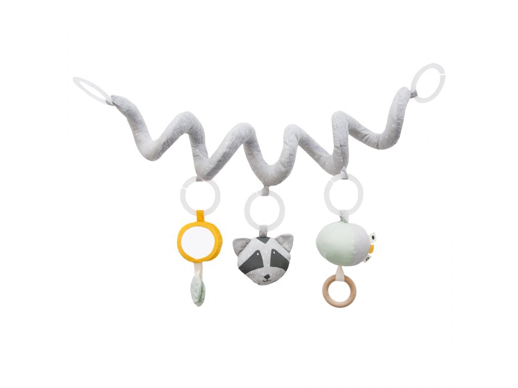 Díky třem hravým prvkům vytvoří tato spirála usměv na každé malé tváři! Spirála se dá pěkně zatočit kolem jakéhokoli nosítka nebo ohrádky. Tři různé hračky, dřevěný kroužek, šustivý papír a zrcátko jsou připevněny pomocí praktických kroužků, lze je tedy snadno vyjmout a pokračovat v zábavě mimo dětskou postýlku nebo ohrádku.
