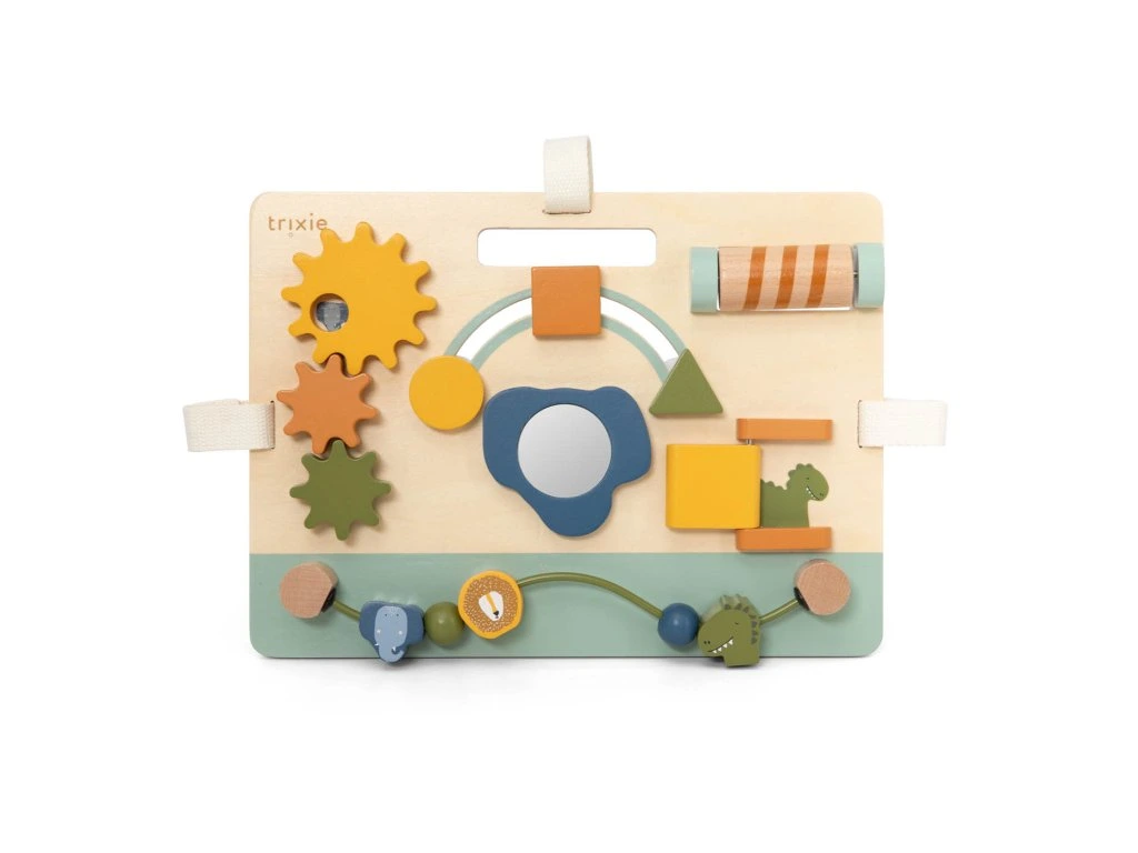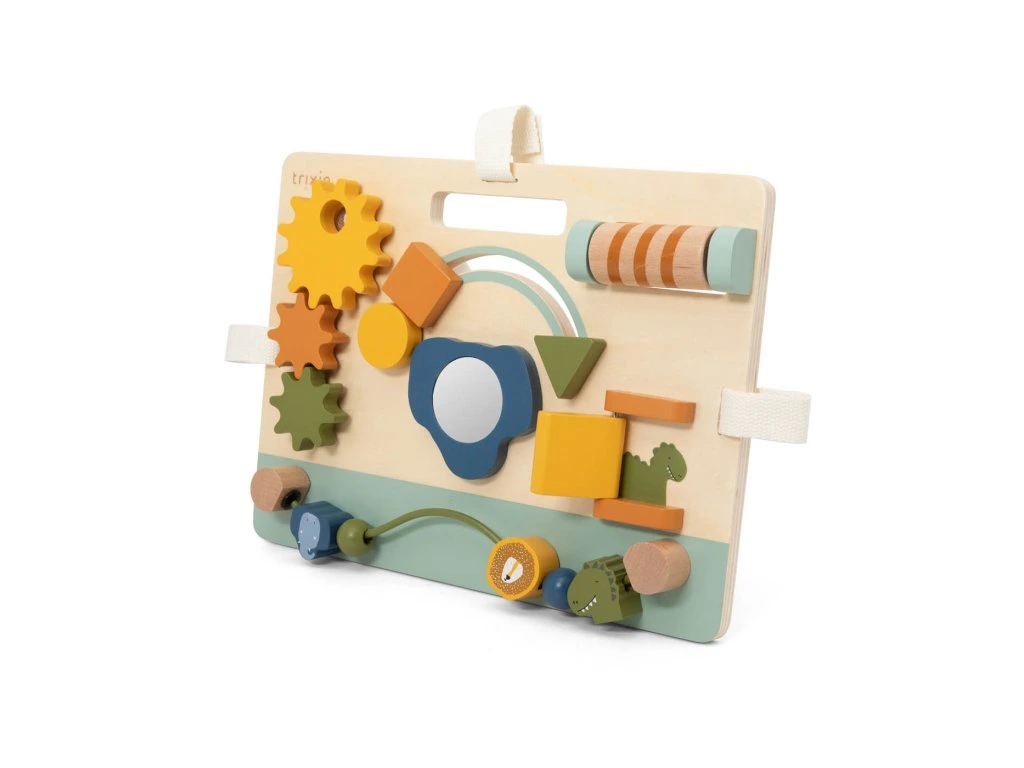 Panel je navrhnutý s láskou tak, aby stimuloval zmysly a rozvíjal jemnú motoriku. Vďaka praktickej rúčke sa ľahko prenáša a pomocou bavlnených popruhov ho možno pripevniť k postieľke či ohrádke.