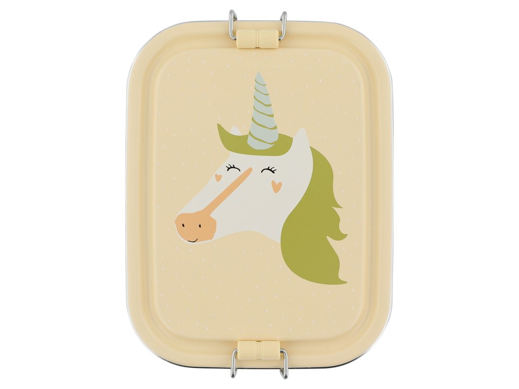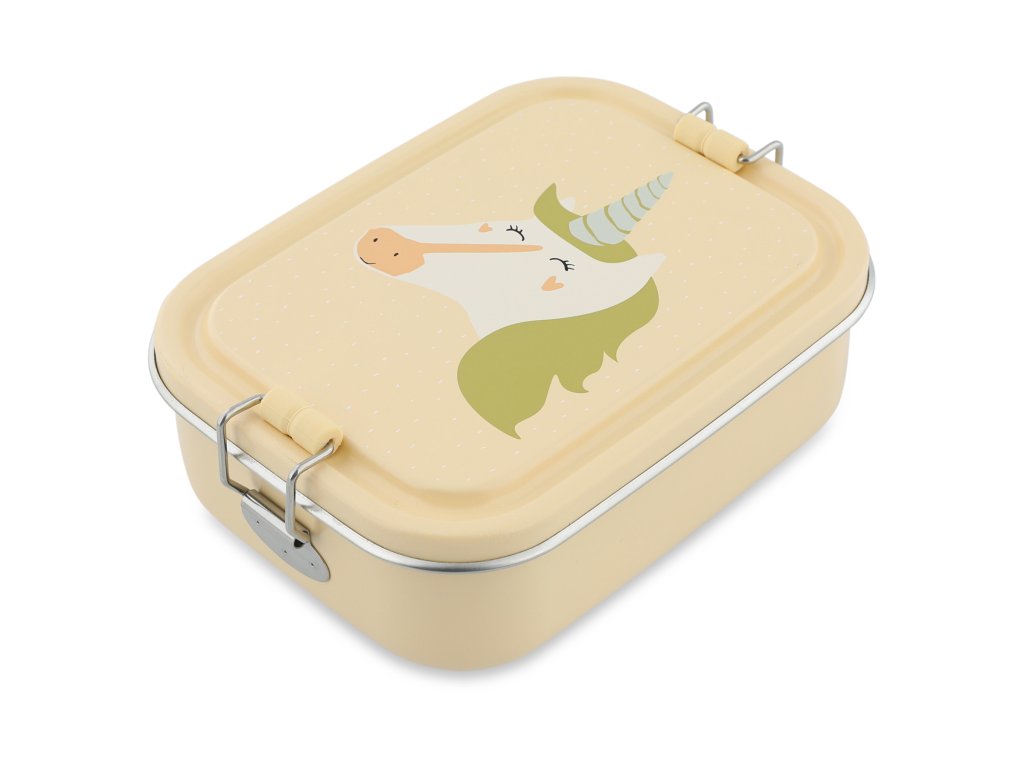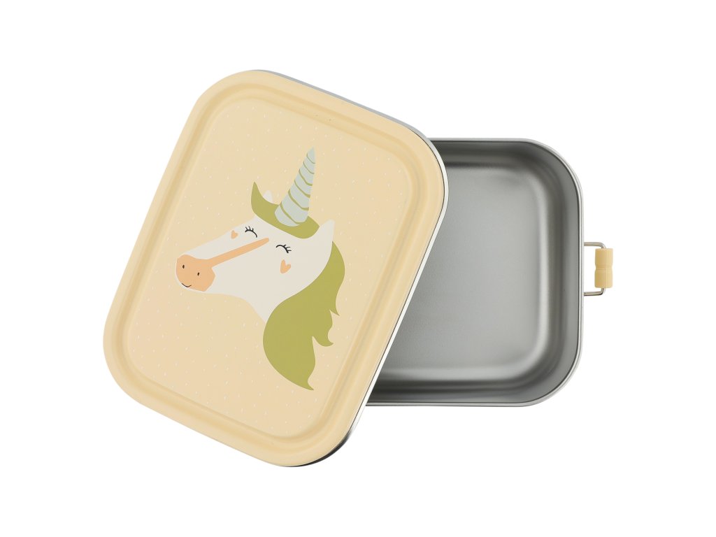 Děti mohou tento obědový box ovládat samy, protože se velmi snadno otevírá a zavírá přezkou. Vejdou se do něj 4 lahodné plátky chleba. Tento odolný obědový box je vyroben z nerezové oceli. Díky tomu neobsahuje žádné škodlivé chemikálie a splňuje všechny přísné normy včetně LFGB (nejpřísnější legislativa v oblasti potravinářství v Evropě). Nerezová ocel je ideálním materiálem pro skladování potravin, protože neabsorbuje žádnou barvu, chuť ani zápach.