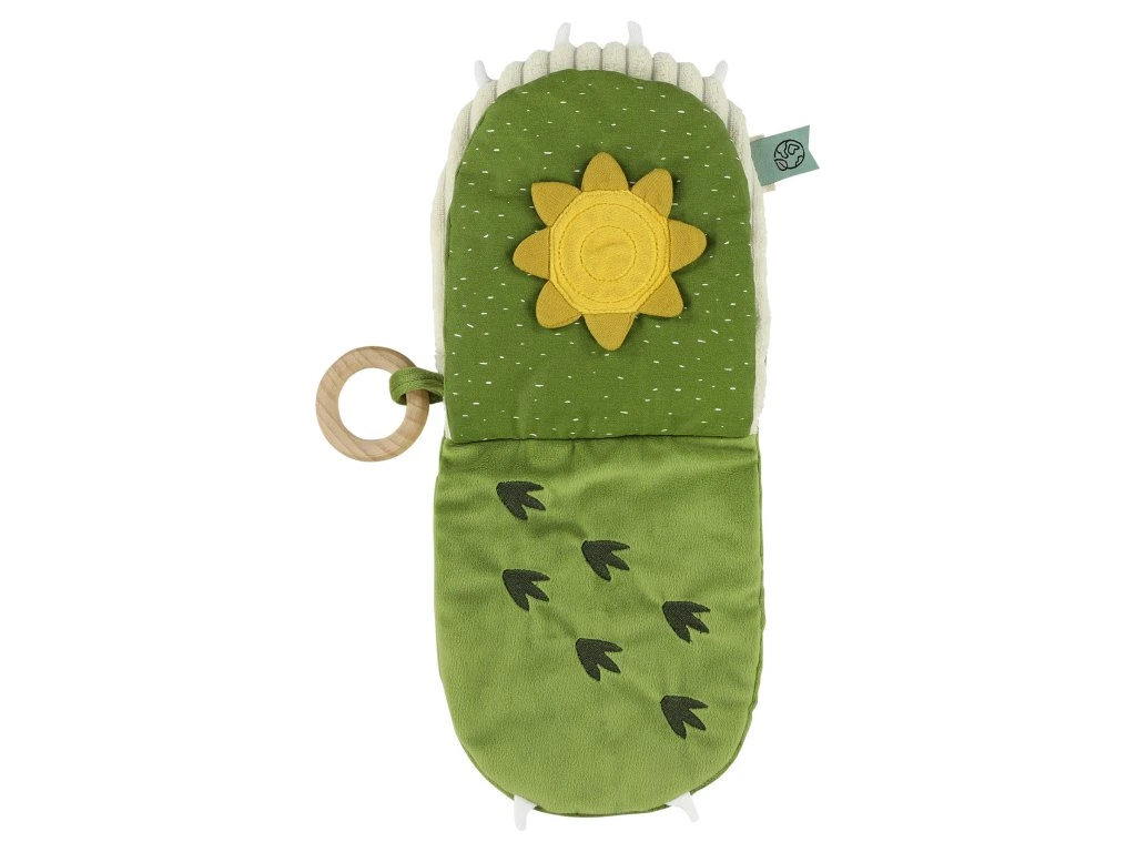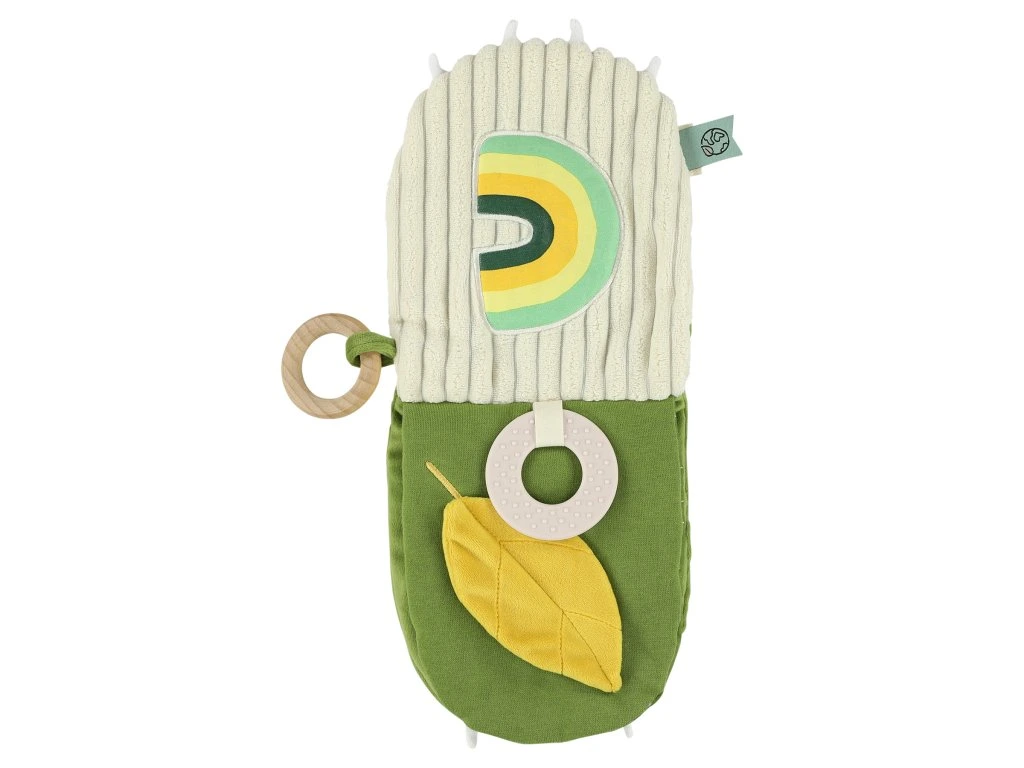 Usmiata tvár a príjemný textilný povrch skrývajú mnoho podnetov pre skúmanie, počúvanie, dotyk i uchopenie. Nájdete v nej hryzátko, zrkadielko, drevený krúžok i šuštiace prvky – ideálna hračka pre rozvoj detských zmyslov a zvedavosti.