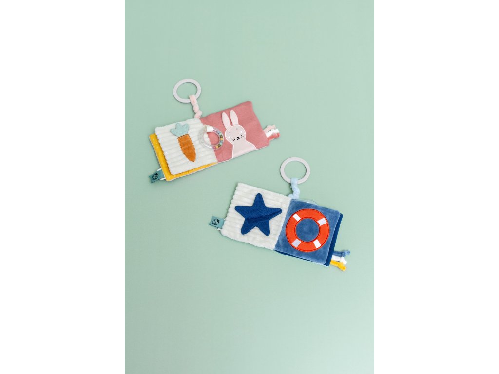 Při zkoumání různých látek, nahlížení do zrcátka a otáčení stránek se přirozeně rozvíjí jemná motorika, smyslové vnímání i fantazie, když si dítě tvoří vlastní příběh plný barev a dobrodružství.