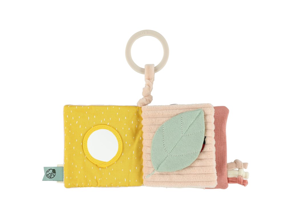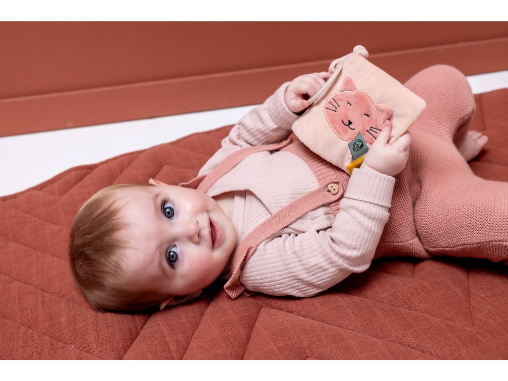 Zavěste tuto krásnou textilní knížku paní Kočičky na kočárek, autosedačku nebo nákupní vozík a nechte své děťátko objevovat její veselé barvy, zajímavé textury a chrastící korálky – ať už jste kdekoli.