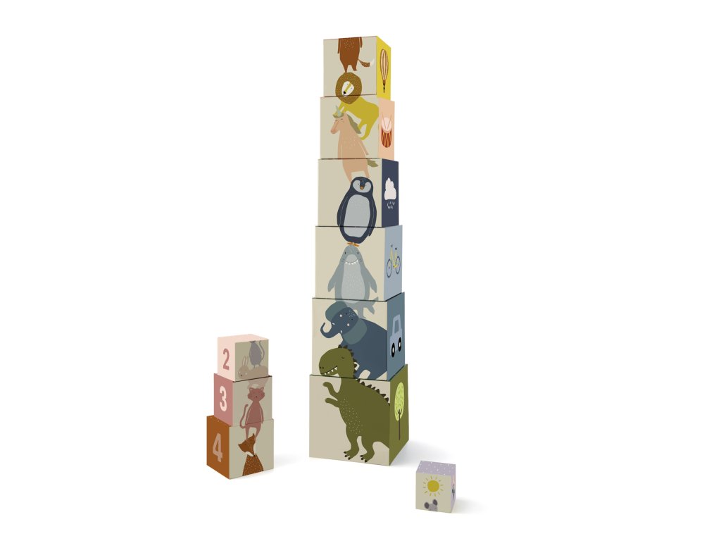Tyto stohovací kostky jsou zárukou zábavy! Na každé straně kostek objevíte jiný motiv. To dětem umožňuje učit se hravým způsobem. Sada obsahuje 10 barevných kostek. Děti si mohou kostky skládat jako pěkné zvířecí puzzle, skládat je podle velikosti, nebo se učit čísla a předměty.