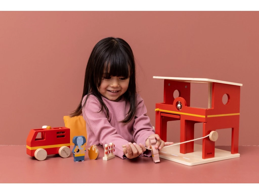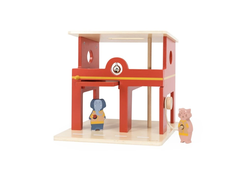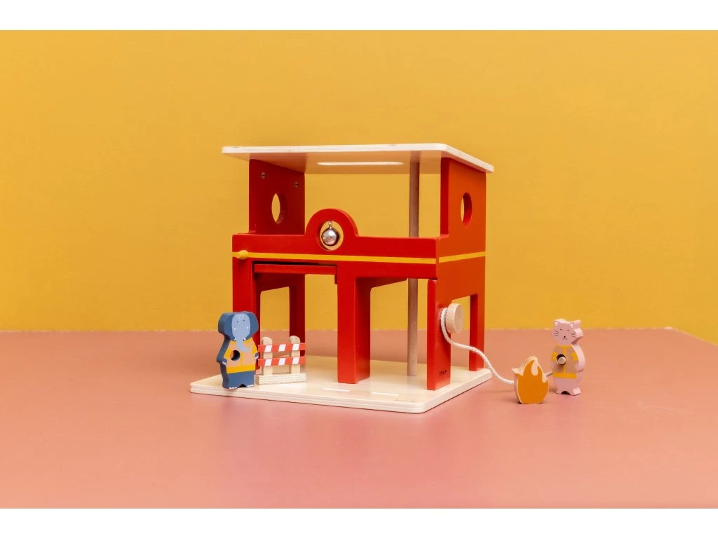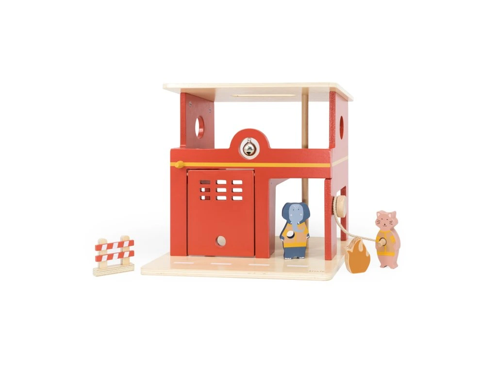 Horí! Niekto potrebuje našu pomoc. Náš tím statočných zvieratiek je pripravený na záchranu v tejto krásnej drevenej hasičskej stanici. Chyťte hasičskú hadicu, otvorte bránu a ponáhľajte sa na miesto požiaru, pričom popustite uzdu svojej fantázii a kreativite. Keď je čas ísť domov po náročnom dni v práci, je k dispozícii pohodlná rukoväť pre jednoduché prenášanie.
