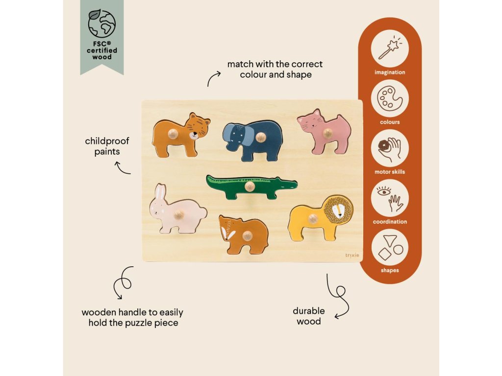 Na první pohled jednoduchá hračka skrývá víc, než se zdá – barevné zvířecí dílky s kulatými hranami a veselými obličeji pomáhají dítěti procvičovat úchop, koordinaci ruka–oko i logické myšlení. A když si budete hrát spolu, naučí se přitom i svá první zvířátka.