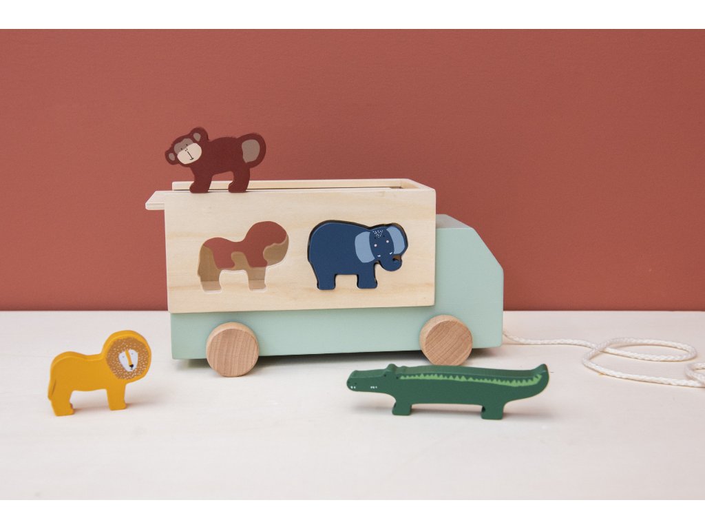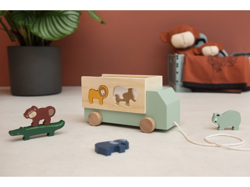 Krásná zvířátková tahací vkládačka. Tento náklaďák má na palubě 5 zvířecích přátel. Můžete je vzít na výlet všechny spolu. Vpředu šňůrka na tažení. Otvory na boku vyzývají děti, aby prostrkávali zvířátka dovnitř do auta, a zlepšovaly tak svou jemnou motoriku. Vysuňte střechu vozíku, a všechny zvířata zase snadno vyndáte. Tato zvířecí parta je skvělá k vymýšlení těch nejdivočejších dobrodružství.
