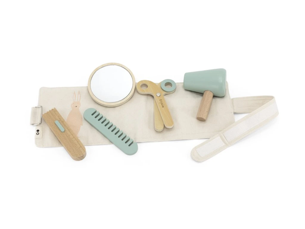 Vlasy česajte, strihajte, hoľte alebo fénujte a sledujte výsledok v malom zrkadielku. Kapsička s roztomilým zajačikom sa dá pripnúť okolo bokov na suchý zips. Perfektná na vytvorenie nového imidžu obľúbenej bábiky alebo súrodencov!