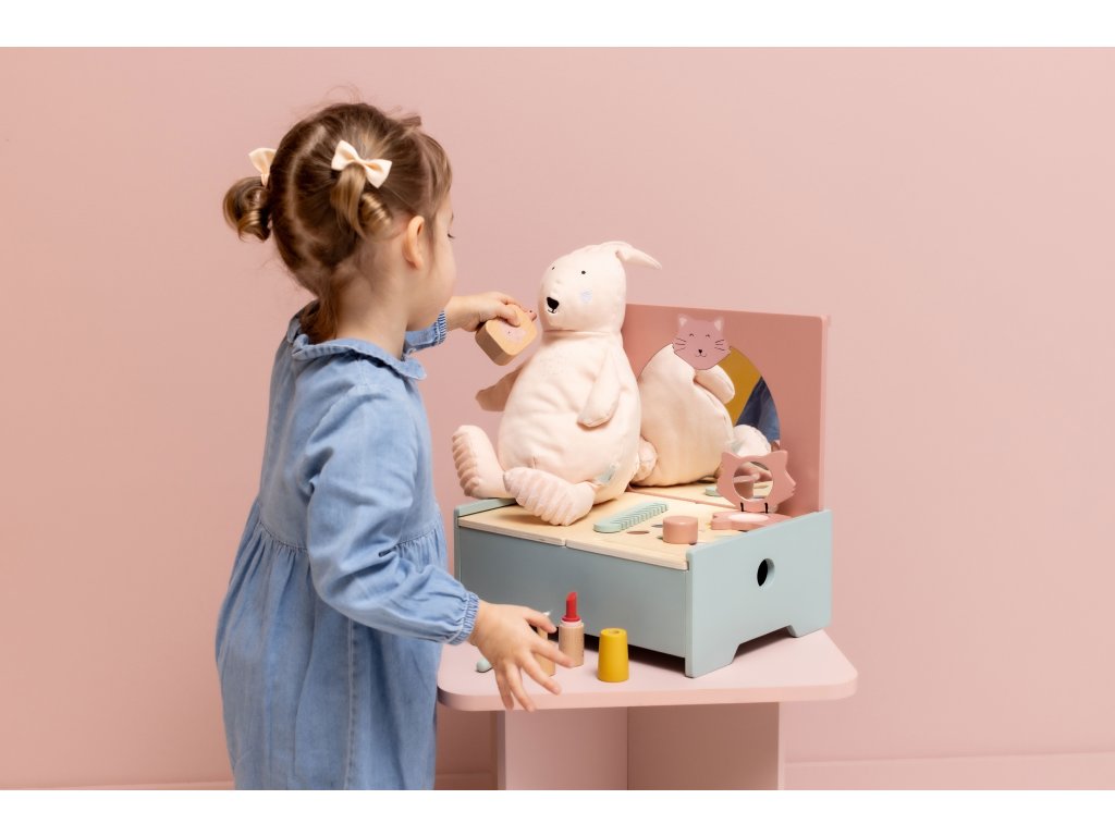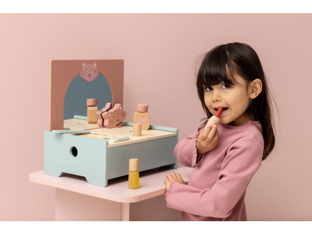 Je čas jít na večírek - pojďme se připravit! Holčičky milují napodobovat svou maminku, takže je tato dřevěná make-upová sada potěší svými pěknými barvami a zrcadlem. Stolek obsahuje hřeben, lahvička s parfémem, rtěnka, tvářenka se štětečkem na make-up, zrcátko a lak na nehty. To vše se perfektně vejde do stolečku. Zábavnou hrou a napodobováním děti rozvíjí své sociální dovednosti při hraní rolí, stimuluje to jejich představivost a koordinaci.