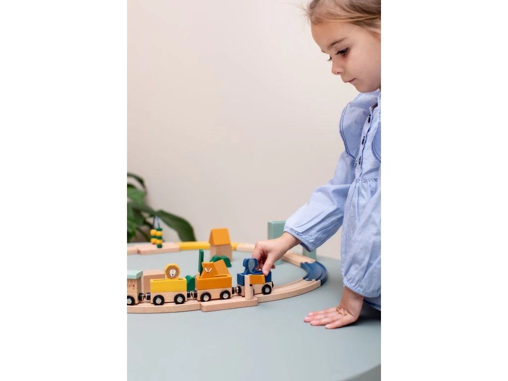 Ideme! Všetci nastupovať do nášho zvieracieho vlaku! Lokomotíva má 3 magnetické vagóny, každý s iným zvieracím kamarátom vo vnútri. Prepájaním rôznych dráh si deti trénujú jemnú motoriku a koordináciu ruka-oko. Hneď ako bude železnica dokončená, môžu deti popustiť uzdu svojej fantázii. Zvonček zvoní zakaždým, keď prejde vlak. S počítadlom môžu deti počítať počet kôl okolo trate. Rôzne varianty a kombinácie vytvárajú zábavný svet, ktorý podnecuje detskú kreativitu.