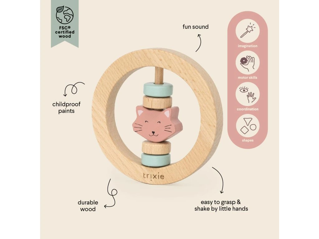 Objavte drevené guľaté hrkálku Trixie s motívom Mrs. Cat, ktorá je ideálnou volbou pre najmenšie deti. Táto hrkálka bola navrhnutá tak, aby perfektne padla do malých detských rúčok a podporila ich rozvoj jemnej motoriky. Pri zatrasení vydáva zábavné zvuky, ktoré stimulujú zmysly dieťaťa a podporujú jeho zvedavosť.