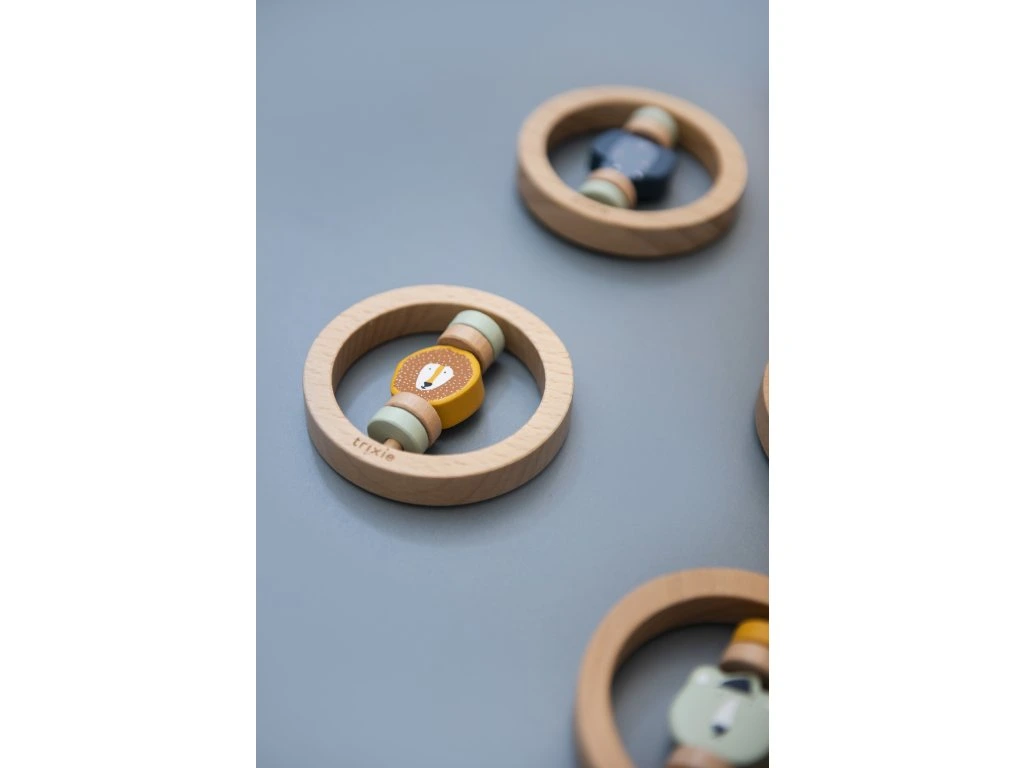 Krásné drevené hrkálka, ktoré sa dobre drží maličkým ručičkám. Na tomto guľatom hrkálku je veľa rôznych častí a tvarov na objavovanie.