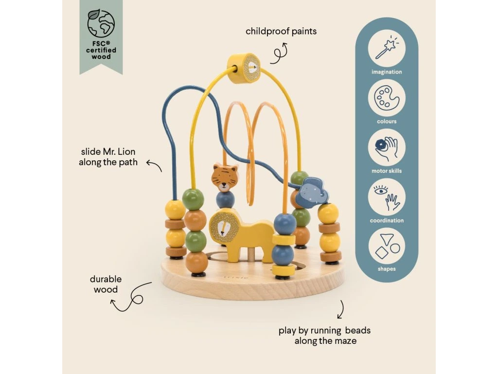 Vaši zvířecí kamarádi vás potřebují – můžete jim pomoci projít bludištěm z korálků? Klasické korálkové bludiště ve vylepšené a větší verzi. Vaše děťátko přichází na pomoc v této krásné hračce s veselými barvami a zvířátkovými korálky – ideální pro rozvoj motoriky, klešťového úchopu a představivosti. Díky vícero možnostem a způsobům hraní je to hračka, kterou si budete užívat mnoho let.