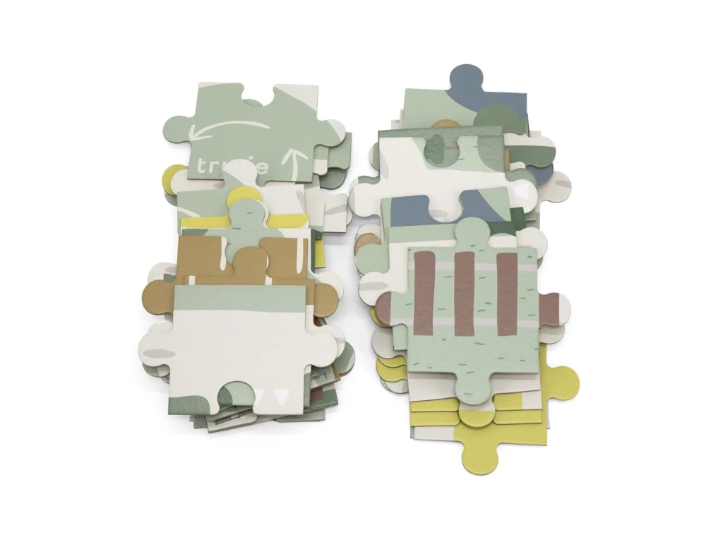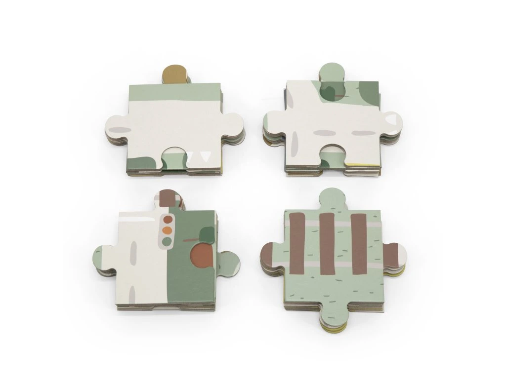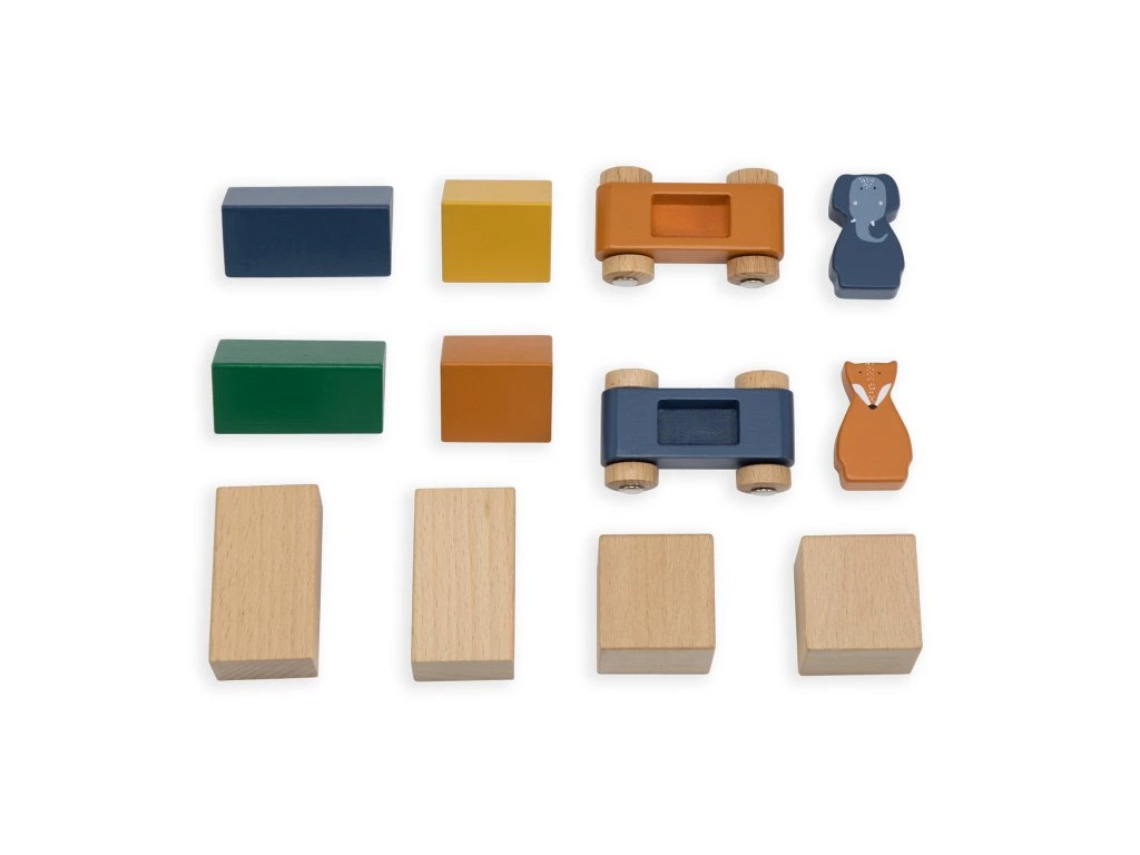 Obsahuje: 54 kusů velkých puzzle, 2 autíčka, 2 zvířátka a 8 dřevěných kostiček