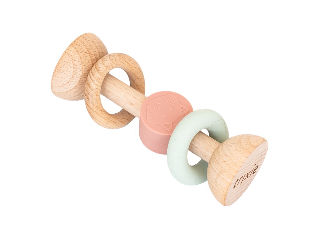 Každý nový kamarád přináší různé smyslové podněty – jemný silikon a hladké bukové dřevo s certifikací FSC® mají zaoblené hrany a veselé barvy, které přitahují dětskou pozornost. Chrastítko vydává jemný, příjemný zvuk a silikonové části jsou ideální pro žužlání při prořezávání zoubků. Pomáhá rozvíjet motoriku i koordinaci ruka–oko.
