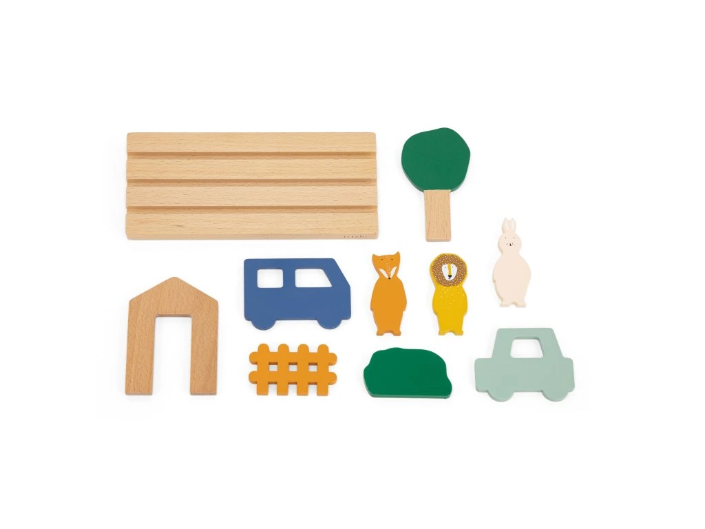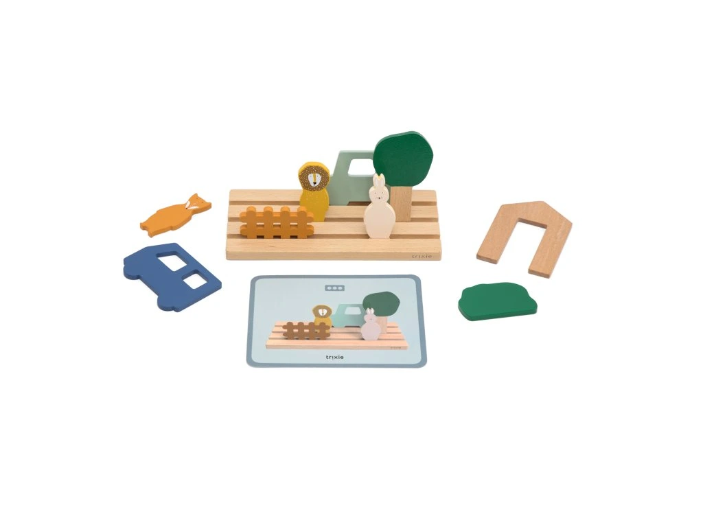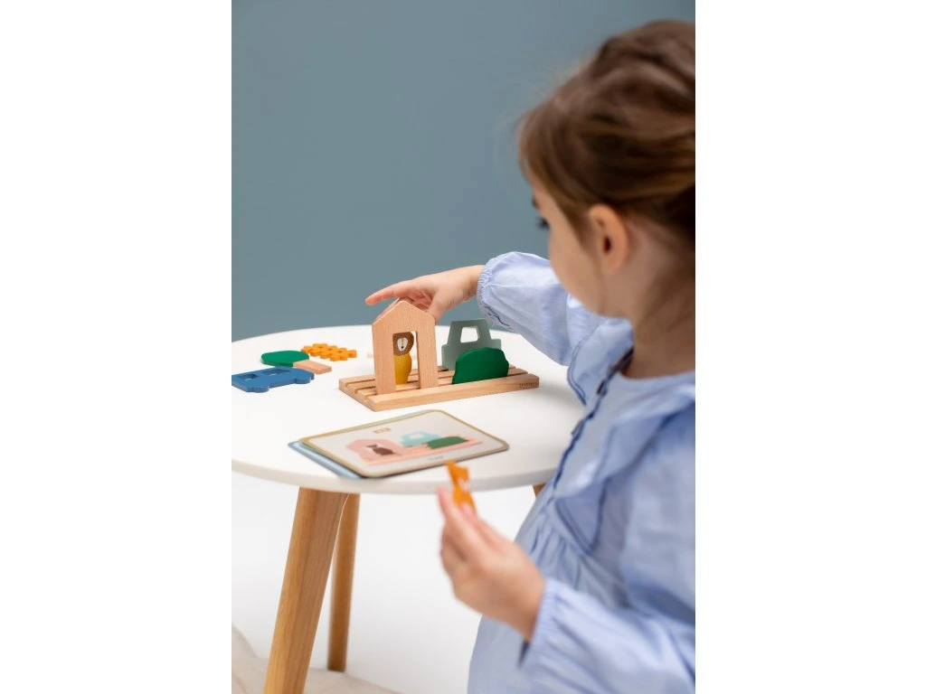 Obsahuje: 1 dřevěnou základnu, 9 figurek, 5 oboustranný kartiček s předlohou