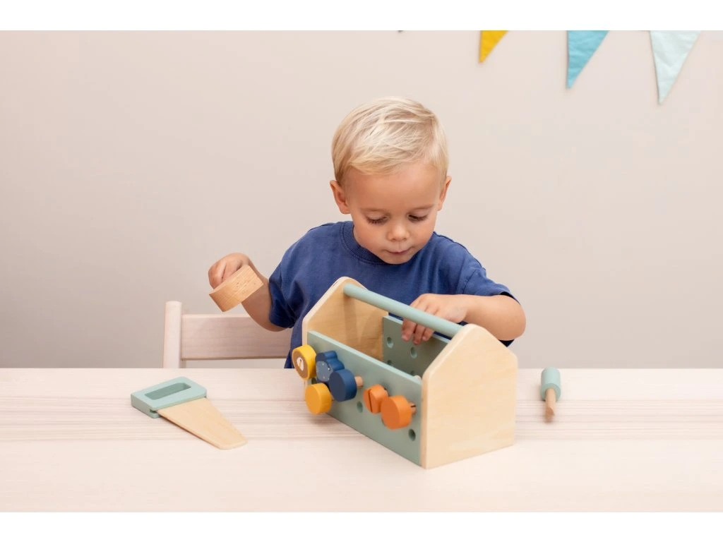 Tato dřevěná sada nářadí podporuje hraní rolí a zároveň stimuluje jemné motorické dovednosti.
